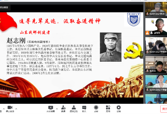 为庆祝我校80周年校庆,引导同学们学习红色校史,乔文锴、季念聪、邹雨等同学向大家介绍了我校首任党委书记兼院长秦华礼、战邮英雄赵志刚和肖华光等人的英雄事迹,激励同学们传承南邮红色基因,在未来的学习和生活中践行南邮精神。