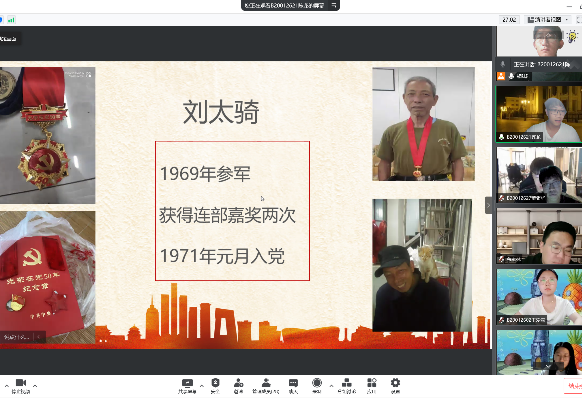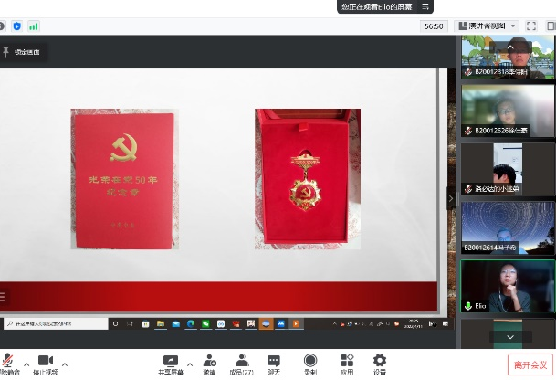 陈龙和杜静怡两位同学分别向大家介绍了他们外公“光荣在党50年”的光辉事迹,陈龙的外公刘太骑寄语支部青年要珍惜当前美好生活,能吃苦,肯奋斗,主动接过党的红色大旗,成为社会栋梁。杜静怡的外公司同滨是一位党龄六十多年的老党员,作为技术兵出身的他深情寄语新一代青年踏实学习专业知识,为祖国和民族的未来舔砖加瓦。
