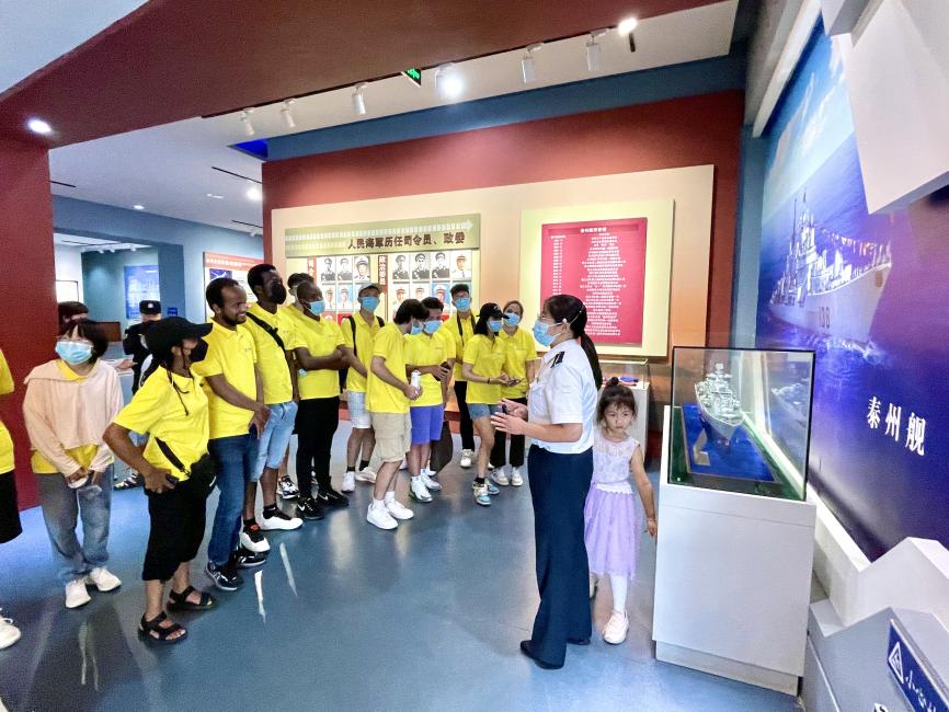 中国人民解放军海军诞生地纪念馆序厅中央矗立的大型浮雕带领中外学生穿越到百万雄师过大江的奔腾年代。一张张历史照片、一件件珍贵藏品、一份份文献史料、一架架飞机雷达,无声诉说着人民海军从无到有、由弱到强不断发展壮大的光荣历史。习近平总书记指出,“建设海洋强国是实现中华民族伟大复兴的重大战略任务”。人民海军诞生以来,一路劈波斩浪,纵横万里海疆,勇闯远海大洋,成为祖国坚不可摧的海防屏障。“海军一路走来是不容易的,是因为他们的守护中国才能够变得如此强大,也是因为他们的付出,我们的生活才能够幸福安康”。泰州籍学生孙锦扬有感而发。
