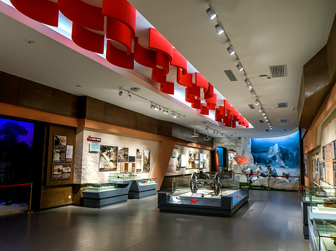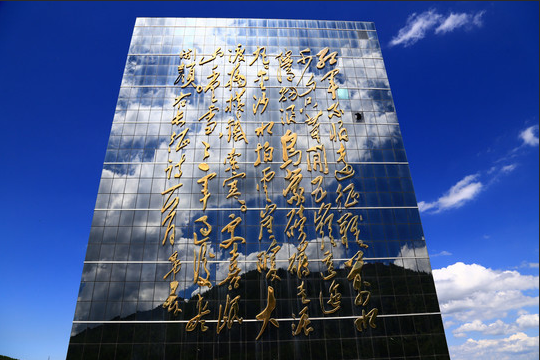 在纪念馆顶部4900平方米的平台上,有着一座气势宏大的纪念碑,高26.8米,长18米,宽4.5米,正面镶嵌有江泽民同志题写的“六盘山红军长征纪念碑”10个镏金大字。纪念观馆对面山峰上的纪念亭和吟诗台则更加彰显了整个景区的恢宏气势。起风时,吟诗台周围的红旗迎风飘扬,不禁让人想起那首脍炙人口的诗歌:“六盘山上高峰,红旗漫卷西风。今日长缨在手,何时缚住苍龙?”