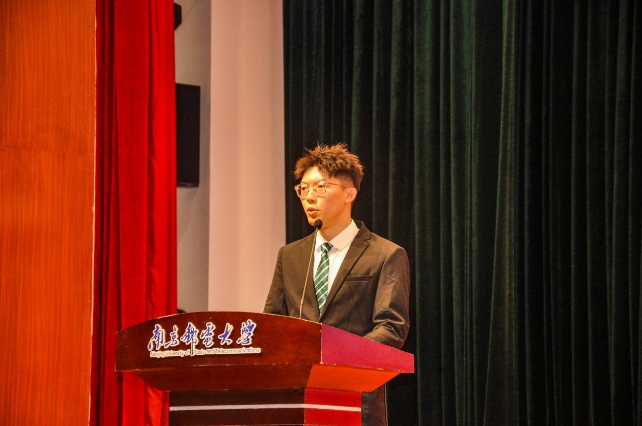 高年级学生代表王于豪对新同学的到来表示欢迎,句句箴言分享自己精彩的大学生活经历,并祝福同学们用奋斗书写青春、用汗水浇灌梦想。新生代表刘佳琪同学总结过往求学路,表达了对未来南邮生活的憧憬与向往。