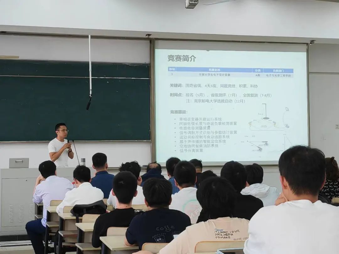 在孙书记发表致辞之后,赵勃老师向参赛同学们介绍了学校和学院科创竞赛的相关情况。赵老师表示,同学们在参加科技竞赛方面的热情很高,并对同学们给予了充分肯定。此外,赵老师依据学科竞赛目录细致地向同学们说明展示了学校、学院的科技竞赛体系,介绍了学院近年来在各类竞赛上取得的成就,并肯定了学院在今年智能汽车竞赛、智能制造等科技创新比赛中取得的优异成绩,希望同学们能够针对其中的一两项比赛继续刻苦钻研,再创佳绩。最后,赵老师指出自动化学院、人工智能学院十分支持开展各项科创竞赛,并期待有更多学生积极与老师沟通,加入到科创的队伍中来。