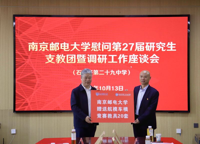 座谈会上,南邮向二十九中赠送航模车模竞赛教具20套,向总场一小赠送国旗班训练教具、美育课教学教具各20套。