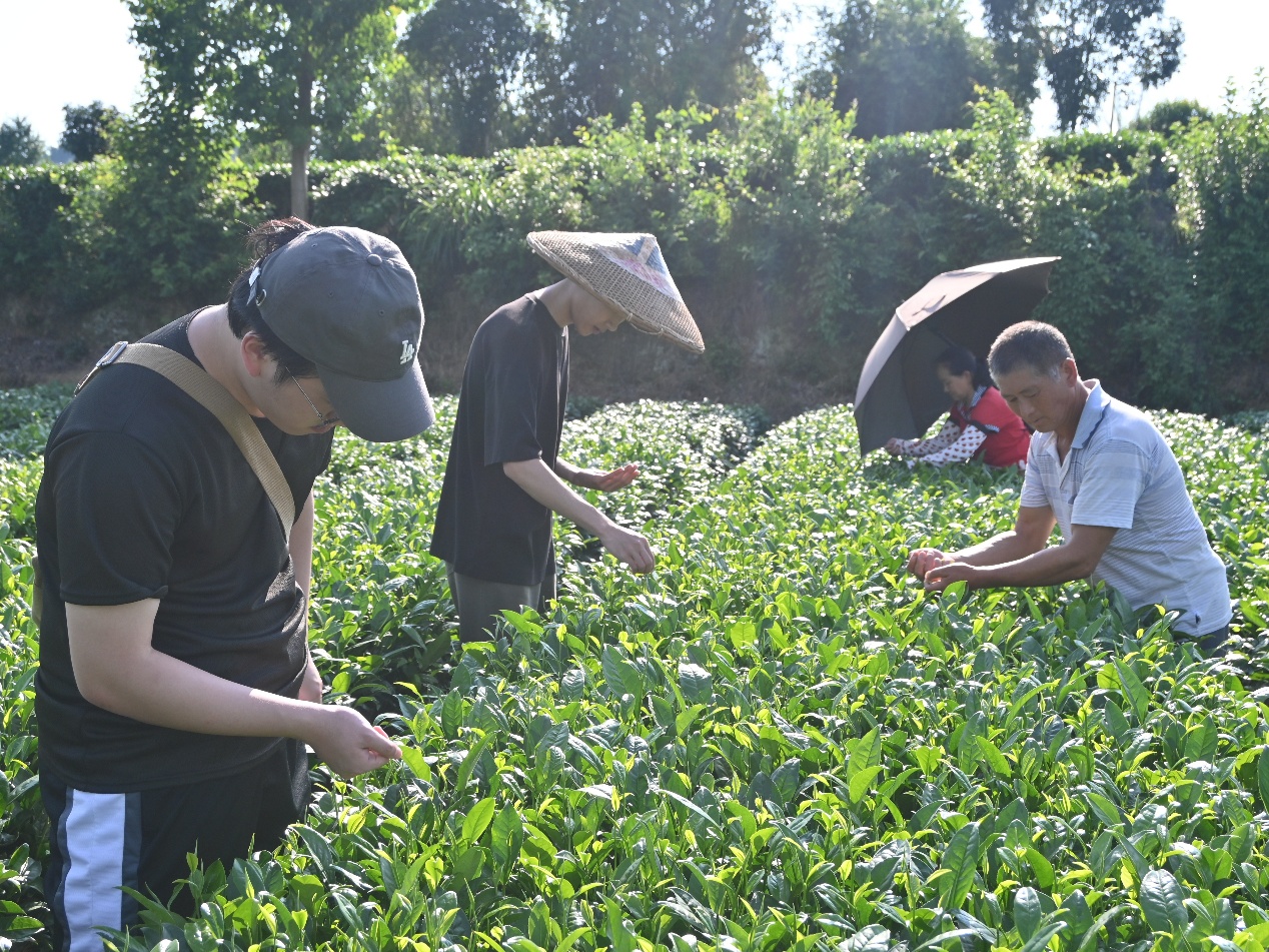 在天城镇祥峰茶业的崎岖茶园中,团队亲身体验山地采茶的艰辛。在尝试采摘过程中,队员们逐渐掌握区分芽叶的技巧。尽管午后高温,手捧鲜翠茶芽时仍感收获满满。