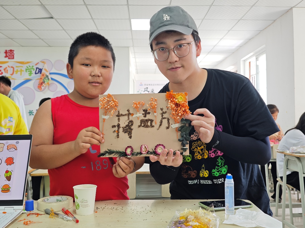 社区暑托班里,队员利用茶渣带领儿童进行手工创作,五公斤茶渣在孩子们手中化为小狗造型、干花拼贴等作品。
