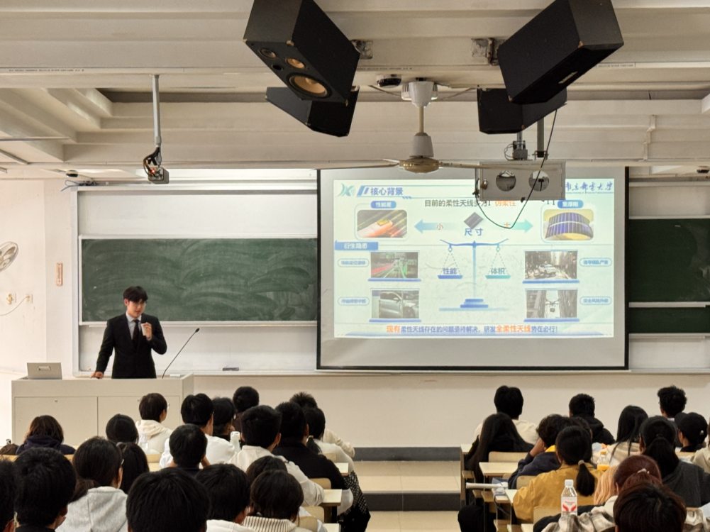 紧接着,“新信向柔——柔性超宽带天线领军者”团队做项目展示。团队对传统天线的刚性局限发起挑战,成功研发出如薄膜般轻薄、可随意弯折的新型天线。团队阐述了该技术在可穿戴设备、柔性显示屏及下一代移动通信等广阔领域的颠覆性应用价值。项目所展现的前沿视野与扎实的工程实践能力,让新生同学们直观感受到了科技交叉融合所迸发的巨大能量。