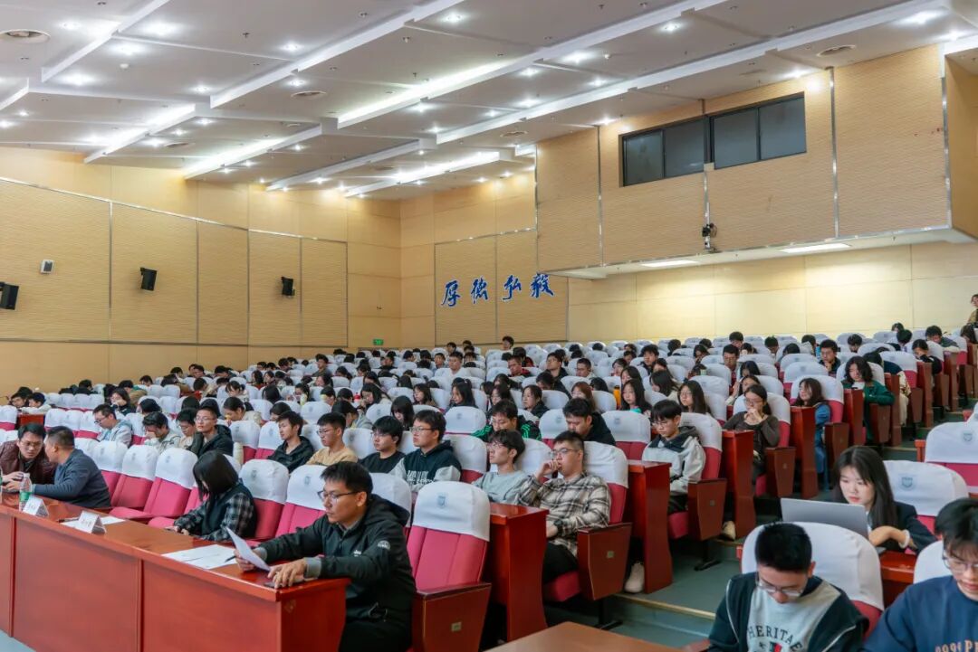 随后,邹辉教授以专业视角展开科创主题分享。他围绕中国国际大学生创新大赛,从项目选题、开展、打磨等维度分享培育经验,详解申报材料的核心要点,用鲜活案例为同学们冲击高水平科创赛事提供了系统性、可落地的指导思路。邹教授以“热爱、无私奉献;踏实、坚持自己;真诚、用心去做”的心得,为新时代大学生引路领航。