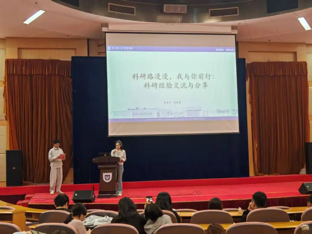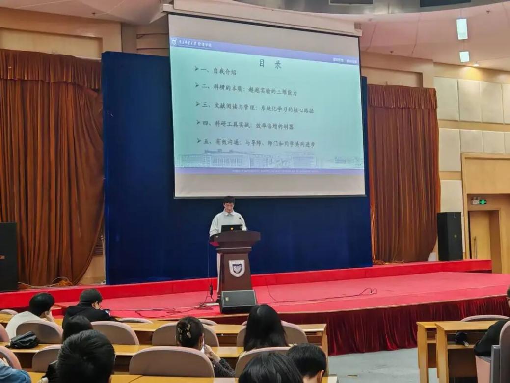 为助力同学们深化对科研工作的理解,掌握高效的研究方法与工具,提升科研素养与综合能力。管理学院于10月30日在科技会堂二楼报告厅举办《“菁英·青柚汇”科研经验交流分享会》。本次活动以“科研路漫漫,我与你前行”为主题,邀请了管理科学与工程专业研二优秀学生刘森嶺作为主讲嘉宾,倾情分享其宝贵的科研心得,现场反响热烈。