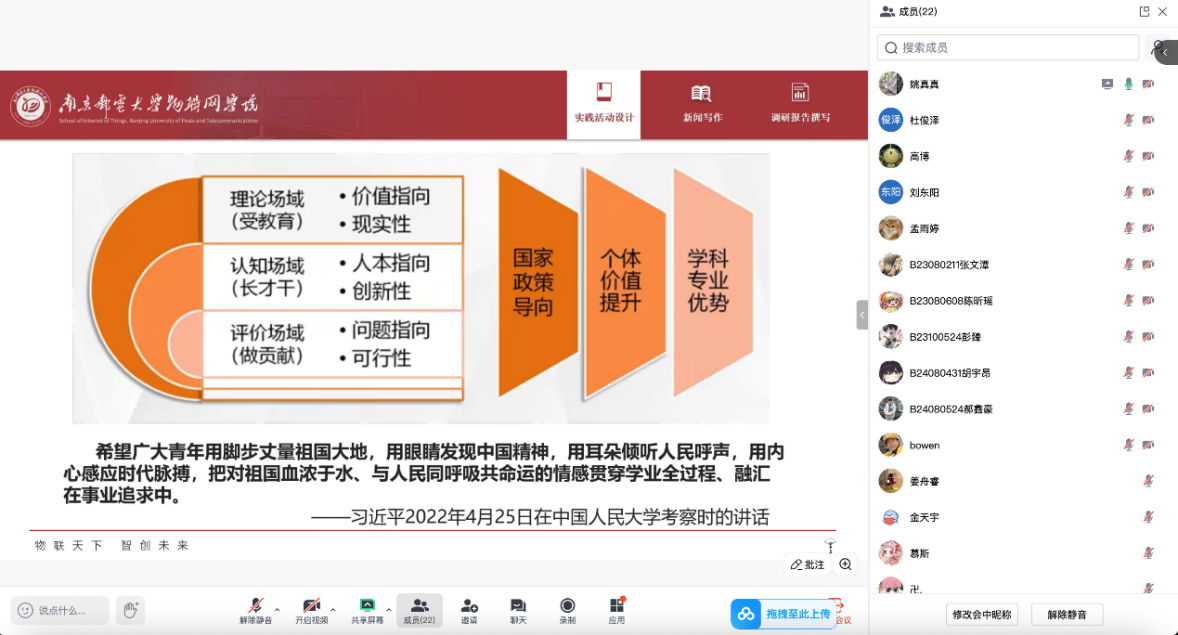 为深入落实“青春为中国式现代化挺膺担当”实践主题,引导青年学子上好“行走的思政课”,在社会大课堂中受教育、长才干、作贡献,7月4日下午,物联网学院于线上召开暑期社会实践行前培训会。此次培训由学院分团委书记姚真真老师主讲,各实践团队负责人、各班级团支书踊跃参加,共同为即将开启的实践之旅蓄势赋能。