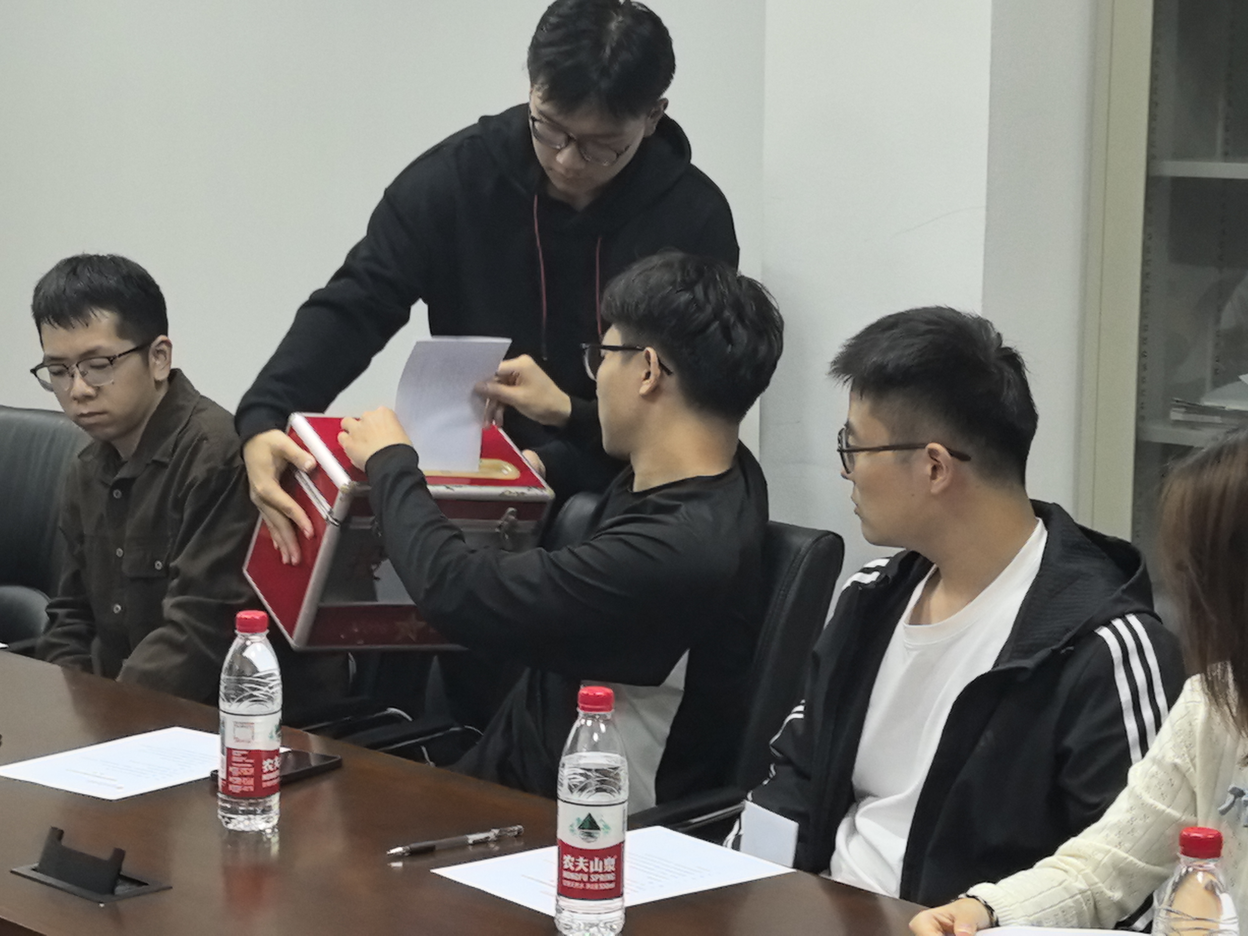 会议第三项议程,与会代表们本着对学院负责、对同学负责的态度,以无记名投票的方式,选举产生南京邮电大学第七次研究生代表大会代表及常任代表,新一届物联网学院研究生会主席团成员。监票人郑啊龙、计票员万成秉持公平公正公开的原则,严格按照选举章程,有序完成选票的发放与计票工作。