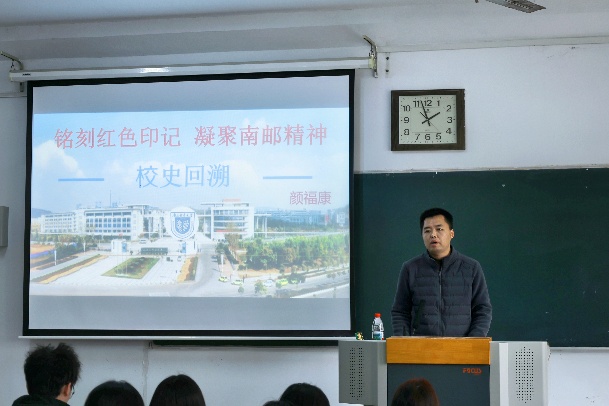 颜老师以“四月始源”开篇,并从“红色印记” “史久源悠”“邮电情结”“援手同门”“百岁寿星”“师者如兰”“邮子风采”等篇章,从不同角度展现了南京邮电大学的办学历史和光辉历程,重点讲解了红色印记、革命传统、邮电情结、育人风采、南邮精神等方面。