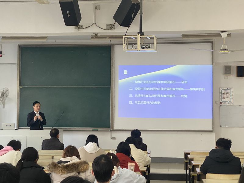 讲座中,沙宁波结合自身多年检察工作经验,从大学生群体高发的网络赌博和非法贷款等高发的法律风险展开系统讲解,从《中华人民共和国刑法》《中华人民共和国治安管理处罚法》对二者进行了定性区分以及参与其中可能会出现的法律后果。沙宁波通过多起大学生参与的真实案例,剖析了网络赌博必输的运作逻辑,揭示其对个人财产、学业前途及家庭关系的毁灭性伤害;在非法贷款领域,沙宁波重点讲解了贷款行为可能出现的后果,通过“杀猪盘”诈骗套取贷款、创业借贷暗藏的连环陷阱、交友过程中被诱导贷款、网络打赏过度透支导致的借贷危机等多个真实案例,详细拆解不法分子的套路逻辑,为同学们敲响法律与风险双重警钟。此外,沙宁波还补充了违法犯罪预防要点:提醒同学们戒掉侥幸、懒惰、贪婪心理;健康生活,远离不良嗜好;提高自我保护意识,不轻信他人;拒绝虚拟货币,一切炒币都是违法行为。