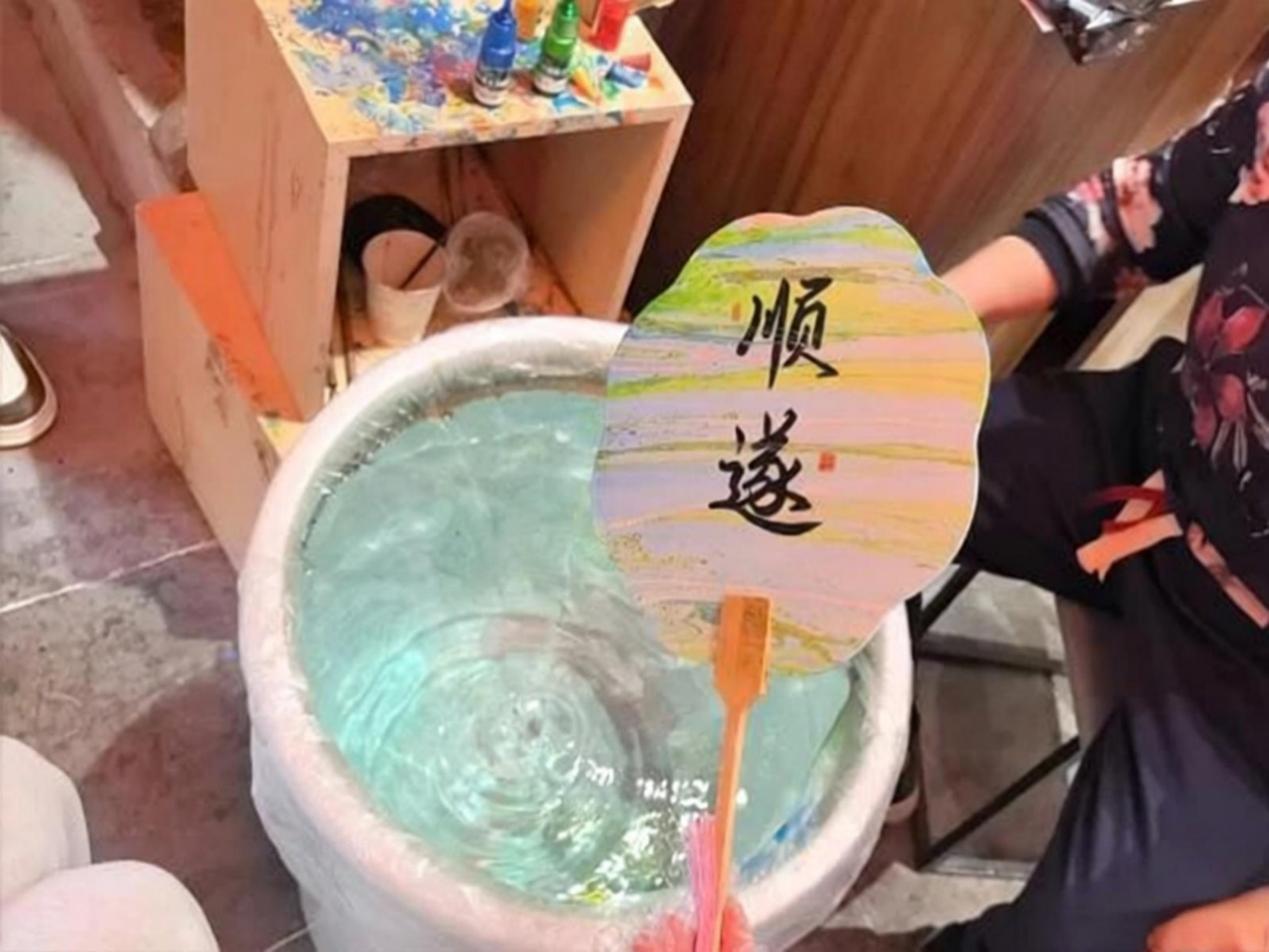 在漆扇的制作过程中,师生们不仅充分发挥了创意,更体验到了色彩在水中的独特魅力。随着扇面缓缓浸入水中,颜色在水中自由荡漾,形成了一幅幅独一无二的图案。每一把漆扇都承载着师生们的创意与热情,成为非遗文化与现代审美的独特融合。