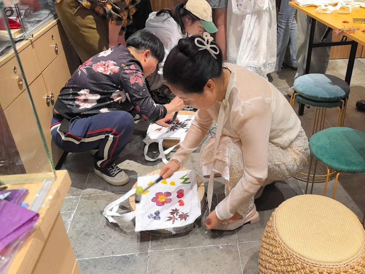 师生们通过体验漆扇制作、点翠、玻璃画和植物拓染四种极具代表性的非遗项目,沉浸式地感受非遗的魅力,体会传统文化之美。活动伊始,传习馆的老师详细介绍了四种非遗项目的制作方法和背后的文化内涵,并展示了精美的样品。在老师的引导下,同学们在欢声笑语中踊跃选择自己想体验的非遗项目,现场气氛热烈而欢快。