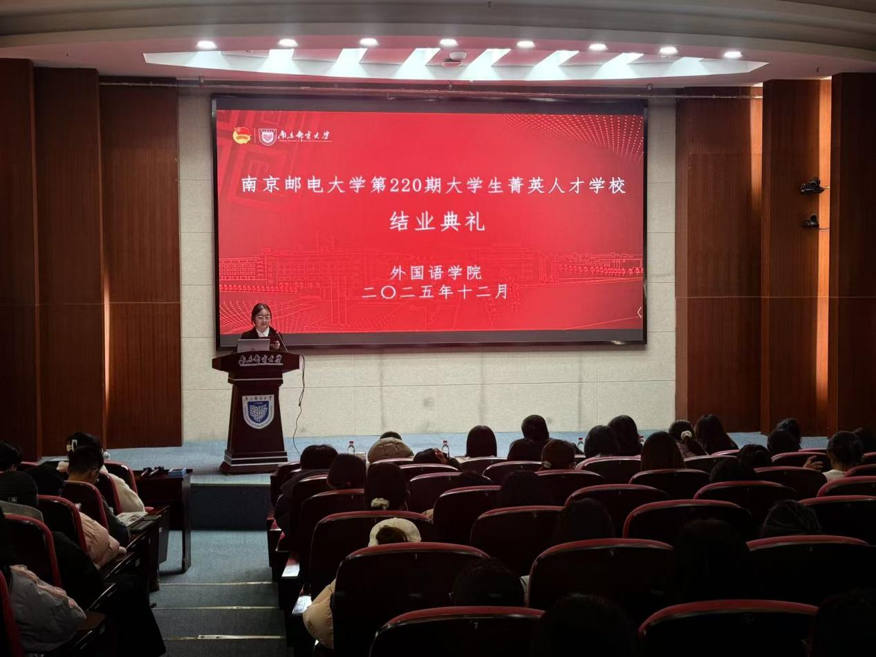 2025年12月10日晚上18:30,南京邮电大学第220期菁英班人才学校结业典礼在南京邮电大学仙林校区中天科技报告厅举办。学院党委书记陈晓波、全院辅导员老师及全体学员参加典礼结业仪式,结业仪式由外国语学学院青年学习社主席团成员陈施羽主持。