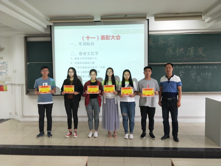 首先,张超老师对全体参会同学进行了考风考纪教育,张老师再三强调作弊带来的严重后果和影响,告诫同学们严禁抱有任何侥幸心理,触碰考风考纪的红线。给全体同学敲响了警钟。其次,张超老师分析了目前全国大学生严峻的就业形势,同时结合已经毕业学生的毕业去向统计数据给同学们进行毕业选择指导,鼓励全体同学志存高远,树立远大的理想信念,本科毕业后都能选择继续深造,为自己未来的发展打下坚实的基础。第三,张超老师对全体同学进行了安全教育,安全问题不容小觑,人身和财产安全都切忽每一位同学的亲身利益,每一位同学都要时刻绷紧保护人身和财产安全的弦,同时不要贪占小便宜,谨防电信和网络诈骗。大会的最后进行了优秀学生和文明宿舍表彰环节。张老师先后为获得“军训标兵”、“宿舍文化节先进个人”等获奖集体和个人颁奖并合影留念。本次表彰环节等充分发挥了先进典型示范引领作用,极大地调动了同学们的积极性,同时也增强了集体荣誉感和凝聚力。