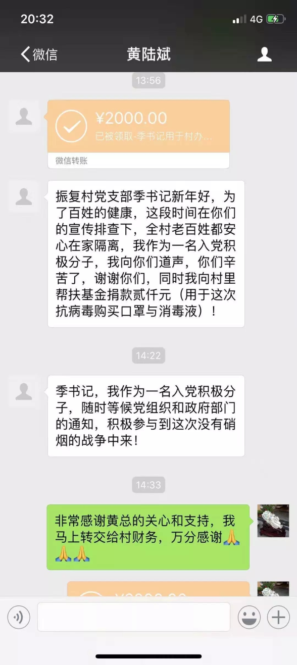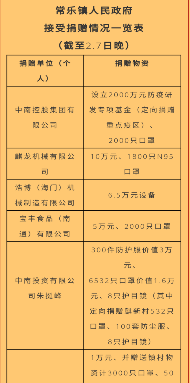 常乐镇的其他爱心人士也用自己的实际行动,为战“疫”汇聚力量,增贴温暖。有大型的集团公司:总部位于常乐的中南集团设立2000万元防疫研发专项基金(定向捐赠重点疫区),海门市麒龙机械制造公司捐赠了10万元和1000只N95口罩……有普通的村民:振复村的黄先生积极给村内捐资捐物,为了加强防护保障,无偿捐赠了200个口罩以及2000元用于购置防护用品。麒北街的黄先生作为一名预备党员,不仅为防疫一线的人员赠送了100箱方便面,更积极主动地加入了志愿者的行列。八烈村的徐大爷在家给屋子进行了消毒,为值夜班的村干部留了房间,被婉拒后,依然留了一盏灯,点亮了黑夜,送来人情的温暖……