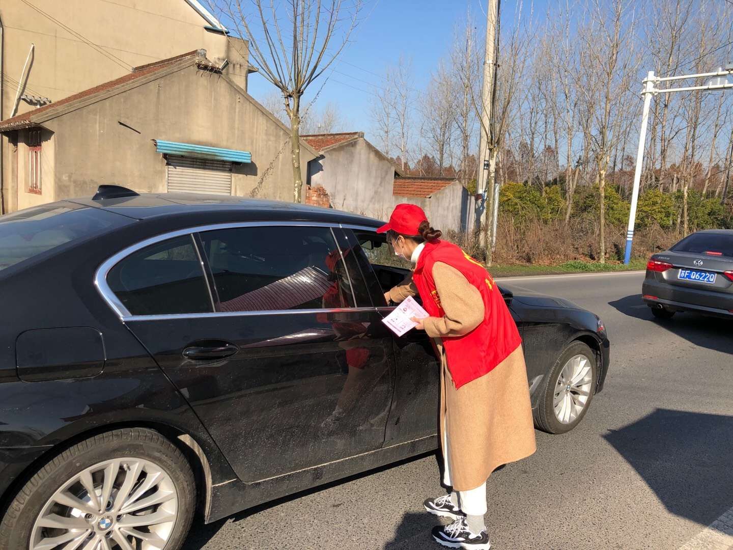 B180904团支部施姣杰向往来车辆、行人发放宣传单页,提醒佩戴口罩