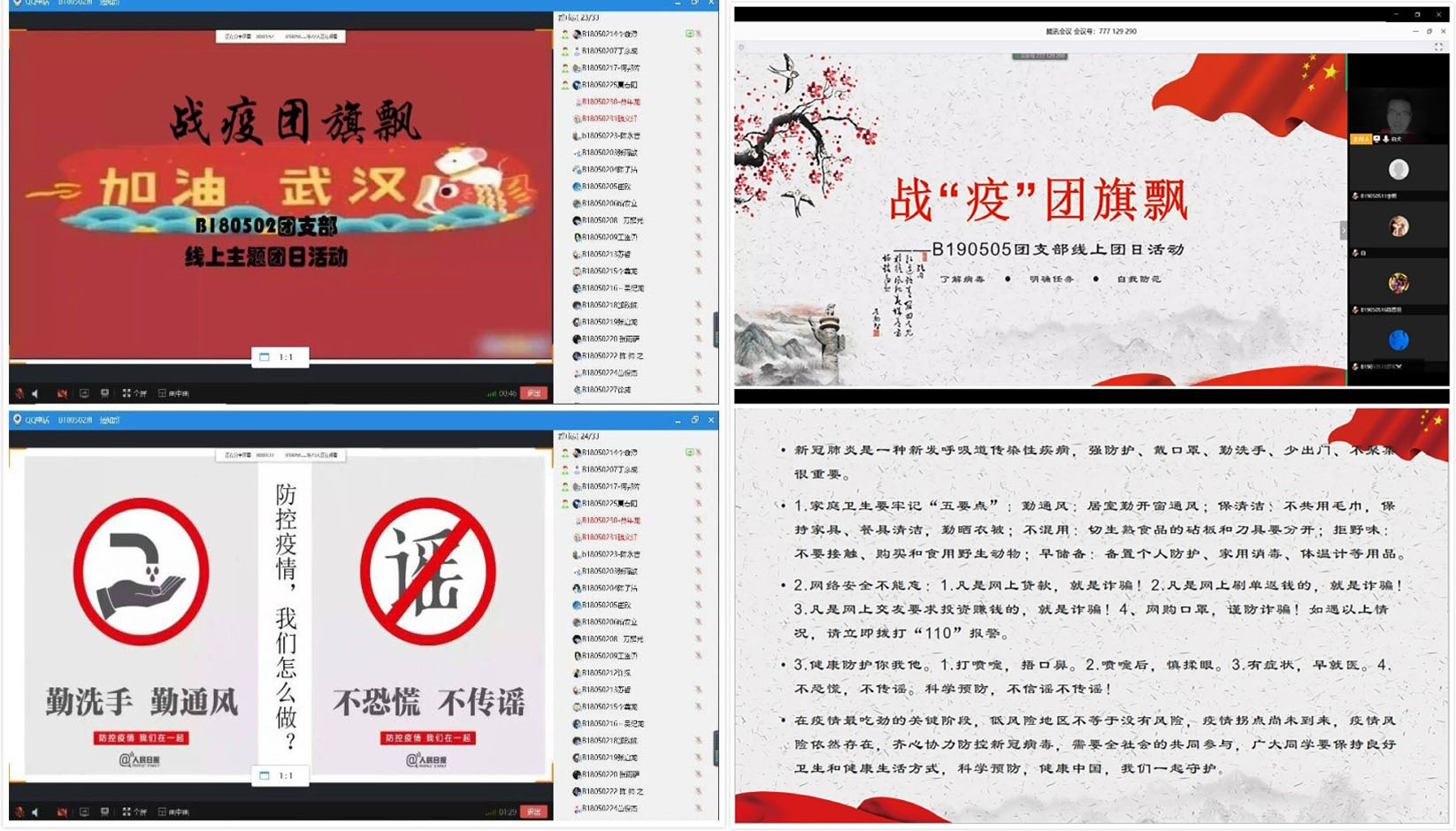 B180502, B190505支部利用腾讯会议,QQ视频等方式开展了线上主题团课,同学们交流分享身边的抗疫故事,为抗击疫情加油鼓劲,共同凝聚抗击疫情的坚定信心。