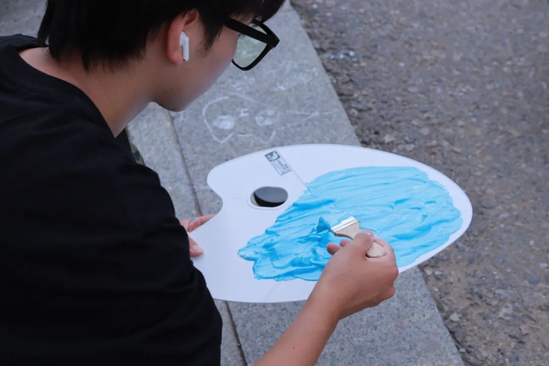 活动过程中,同学们分为图案组和涂色组展开。图案组同学按照设计稿用粉笔定好图案的位置,勾勒出线条轮廓;涂色组同学根据设计稿上的颜色调制所需颜色,并按图案组同学所勾勒出的线条轮廓进行涂色。
