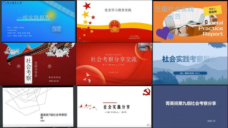 2022年10月19日下午,南京邮电大学第一百一十七期菁英人才学校暨经济学院骨干培训班社会考察交流分享会在线上顺利举行。菁英班全体学员参加了本次会议。