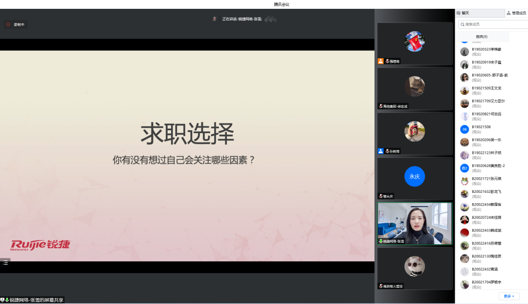 锐捷网络股份有限公司南京研发中心人力资源经理张雪对锐捷网络及其秋招情况做了简要介绍,并针对应届生的求职选择、注意事项等与同学们进行了在线交流。通过张经理的介绍,同学们认识到锐捷网络的主要业务,学习到了简历的制作要点。