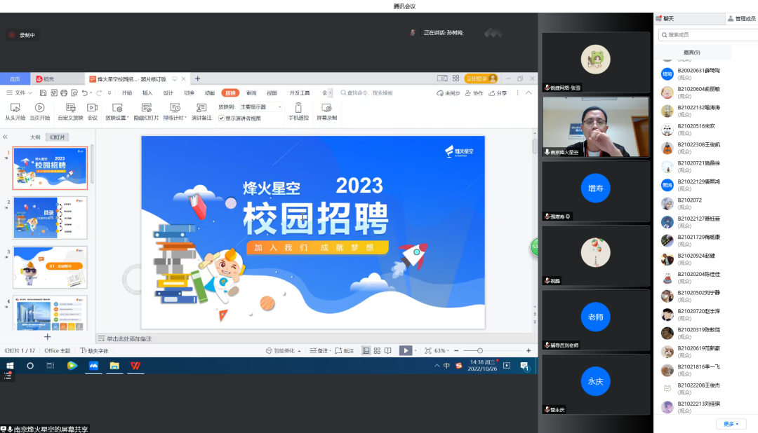 为全面深化落实学校就业工作整体部署,全力保障学院就业工作稳步推进,10月26日下午,由电子与光学工程学院、柔性电子(未来技术)学院主办的合作企业空中宣讲会如期举行。学院党委副书记、副院长徐磊,2023届、2024届毕业班辅导员,2023届毕业生及部分2024届毕业生参加本次空中宣讲会,本次会议由孙树将老师主持。