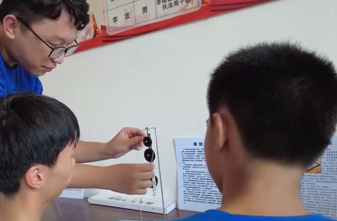 ▲志愿者讲解滑轮的应用