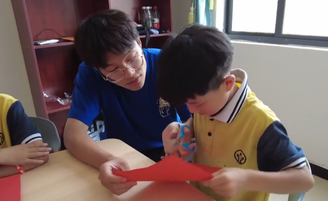 ▲志愿者在指导孩子们剪纸