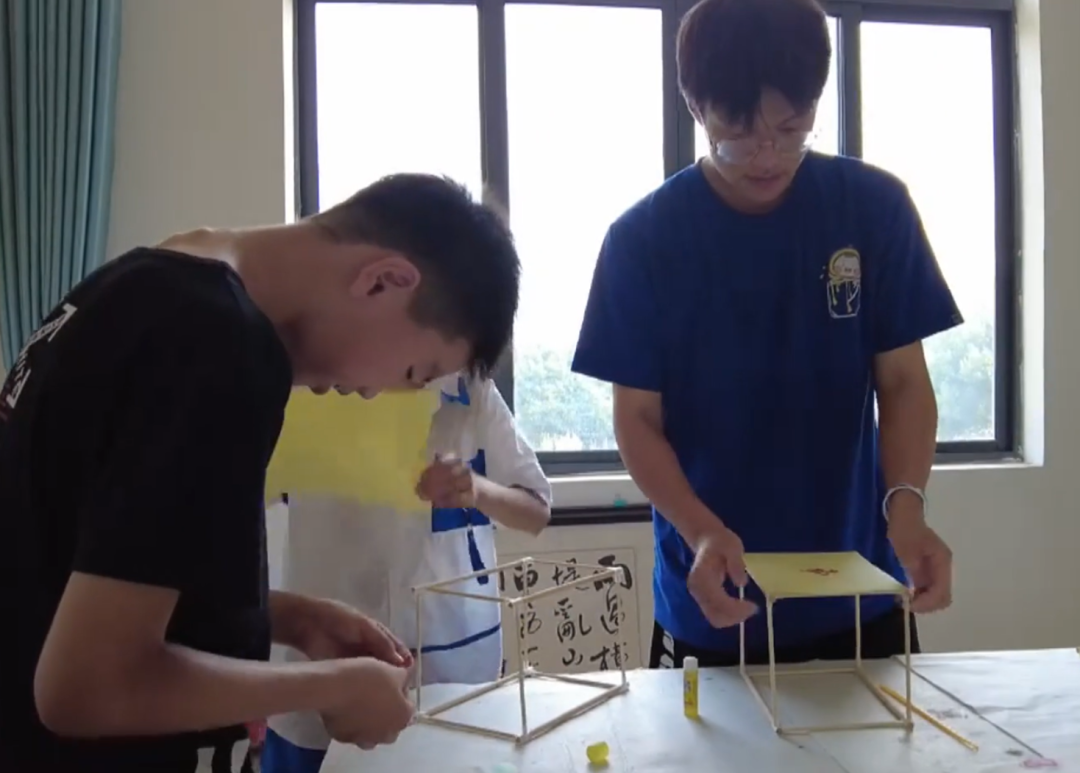 ▲志愿者和孩子们一起做灯笼