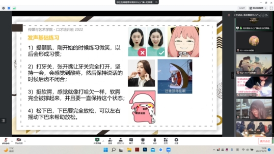 2022年10月19日晚,南京邮电大学传媒与艺术学院联合青年媒体中心广播站,以线上会议的形式,进行了一场主题为“声承战邮星火,心映千里征途”的演讲比赛口才培训,传媒与艺术学院22级全体成员参与此次培训。课堂上,广播站的同学们字正腔圆、声情并茂地进行了讲解,同学们积极参与、认真听讲。