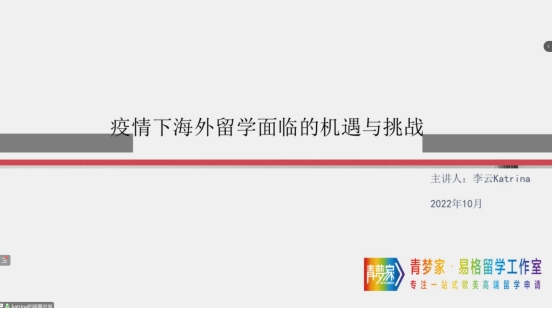 最后,来自“青梦家”的李云老师在前两位校友分享的基础上,给同学们讲解了疫情下海外留学面临的机遇与挑战。李老师结合具体学生实例,深入剖析了同学们在留学申请过程中可能遇到的困难,促进同学们对出国留学深造有了更全面的认知。