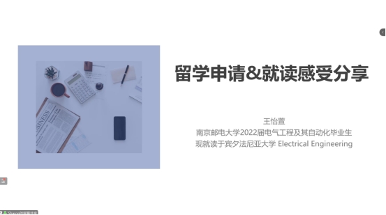 现就读于宾夕法尼亚大学、我院2022届电气工程及其自动化专业优秀毕业生王怡萱同学结合自身的留学申请经历和就读感受,向同学们分享了宝贵经验。她提醒同学们要合理规划大学时间,平衡发展各个领域,摆脱自身畏难情绪,始终保持积极的学习态度,定能成就更灿烂的大学时光。