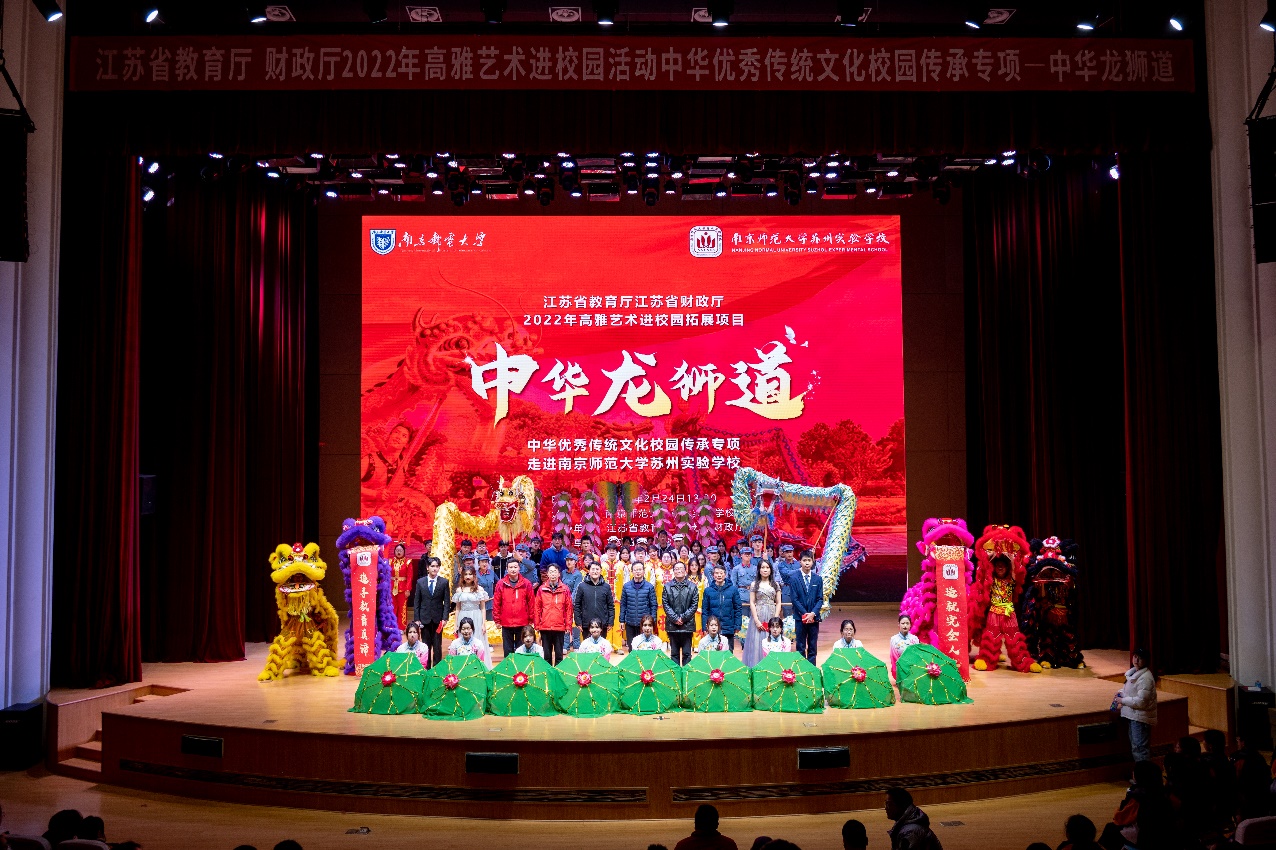 亲近高雅艺术,传承优秀文化,感受艺术魅力,增强文化自信。2023年2月24日下午,由江苏省教育厅、江苏省财政厅主办,南京邮电大学承办的高雅艺术进校园拓展项目——南京邮电大学“中华龙狮道”中华优秀传统文化校园传承专项演出在南师大苏州实验学校报告厅隆重举行。江苏省教育厅高雅艺术进校园拓展项目评估办周玉明老师,南京师范大学苏州实验学校总校长胡金平教授、专家组组长张乐天教授、初中部舒惠校长、小学部卢谦校长、总校德育处徐海建主任、总校办公室姚镇海主任,我校经济学院党委书记董军,与初一、初二年级全体师生齐聚报告厅,共同欣赏了这场文化盛宴。