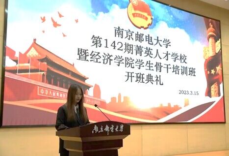 2023年3月15日,南京邮电大学第一百四十二期大学生菁英人才学校暨经济学院学生骨干培训班开班典礼于仙林校区图书馆四楼报告厅顺利举行。南京邮电大学关工委副主任、经济学院关工委副主任储成祥老师,经济学院党委书记董军老师,分团委书记尤波老师及菁英班全体学员出席了本次典礼。本次开班典礼由莫洲嘉同学主持。