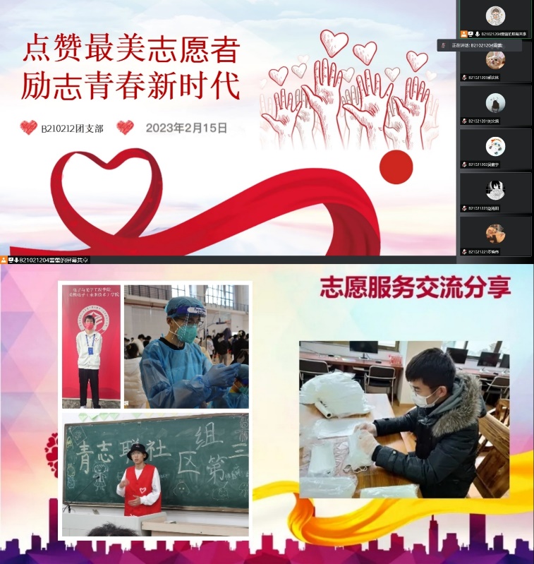 B200208班团支部以座谈的形式,由乔振、刘铖、张靓颖三位同学分享了自己的志愿服务经历,志愿活动包括社区服务、校园防疫工作、公益传播官、云支教志愿者等,三位同学的经验分享体现了我院团员的志愿服务精神,同时也带动大家积极参与到志愿服务中。