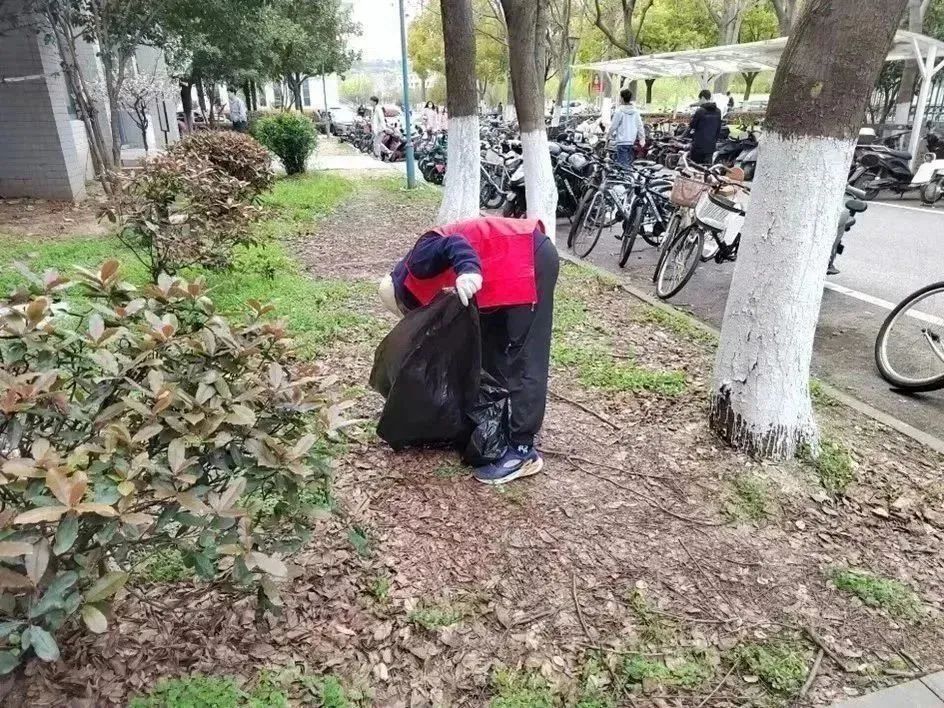活动中,同学们领取所需卫生工具,佩戴防护手套,拎着垃圾袋,拿着扫帚和簸箕,沿途弯腰拾捡草丛和小道上的废弃物、饮料瓶、卫生纸等白色垃圾。同学们还整理摆放停靠在周围的的单车,认真检查并清理了每一处卫生死角,做到了“不放过,不马虎”的自我要求,体现了不怕苦脏累、甘于奉献的精神。
