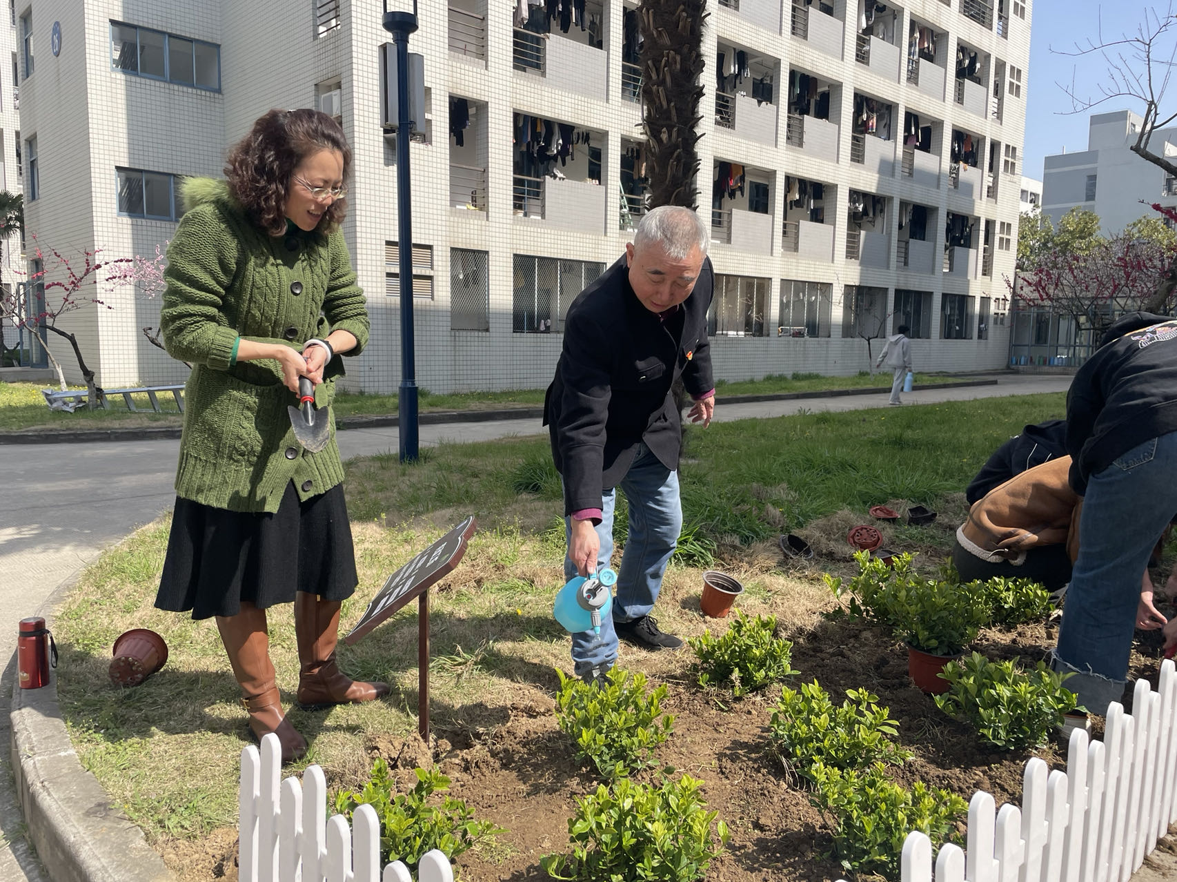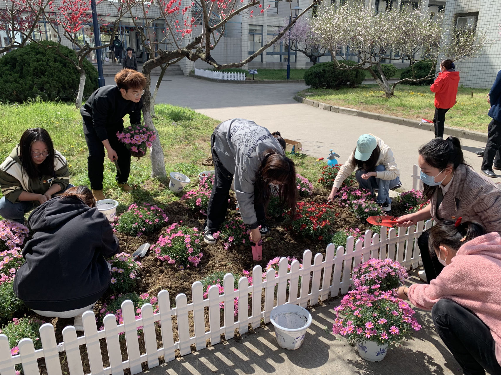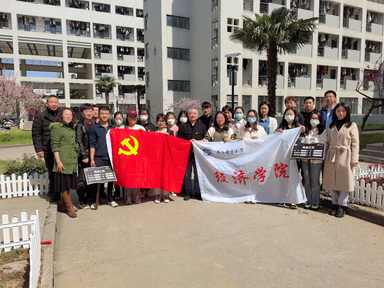 最是一年春光好,花香四溢正当时。为提升支部成员生态环境保护意识和社会责任感,牢固树立“绿水青山就是金山银山”理念,加强学生爱校荣校意识,3月28日上午,经济学院本科学生党支部联合宿舍管理办公室开展了劳动工坊活动,组织支部毕业生党员在仙林校区桃苑宿舍区栽种鲜花、美丽校园。校关工委副主任、院关工委副主任储成祥,宿舍管理办公室工作人员,院本科学生党支部书记、毕业班辅导员尤波,2022级辅导员储宜旭及学院20余名毕业生党员参与了此次活动。