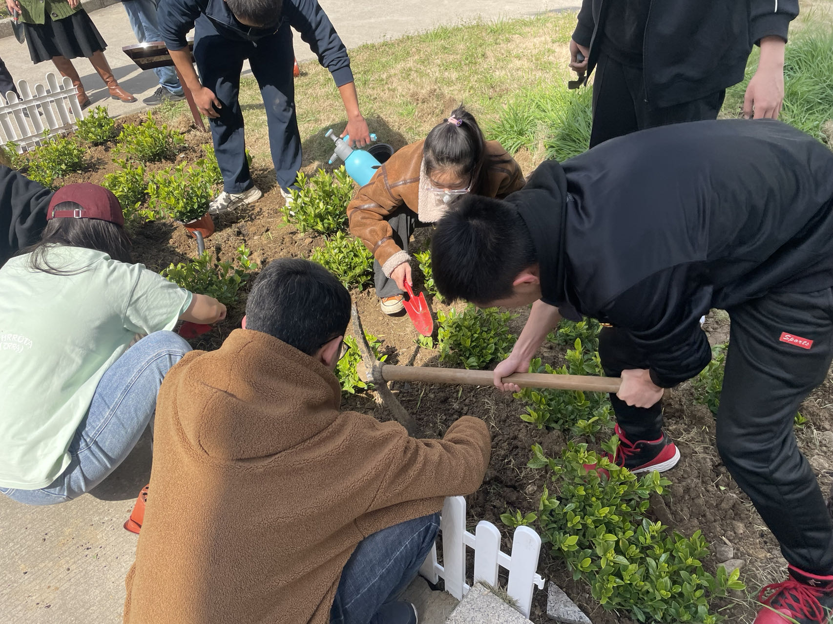 在储成祥老师及宿舍管理工作人员的指导、帮助下,毕业生党员挥洒汗水,热情洋溢、挥锹铲土、填入树苗、培实新土、覆土浇水,整个劳动过程井然有序、配合默契。经过大家的共同努力,朵朵花株错落有致、争奇斗艳,为校园宿舍增添一抹生机。栀子花寓意坚强、永恒、守候;玛格丽特寓意期待、自信、喜悦;绣球花寓意希望、忠贞、团聚。一朵朵含苞待放的鲜花,象征着即将毕业的学生,寄托了学校、学院对毕业生的期望与嘱托,同时也是毕业生留给学校的美好回忆与祝福。