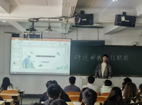 最后,准备入职徐州工程机械技师学院的李明航分享了一些关于应聘体制内工作的经验。他建议同学们多关注想去的地市的人力资源网,并注意报名时间。另外,他还给同学们详细列出了一些注意事项,如:关注企业的组成部分、签订协议时双方的责任与义务等。