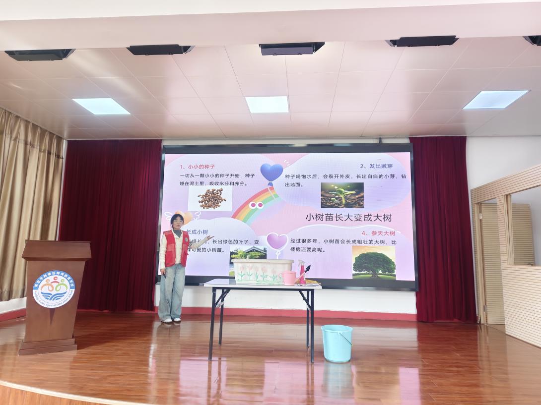 志愿者们提前精心打磨课件、设计课堂互动环节,做好课程准备工作,同时协助特殊学校完成现场引导、流程衔接等保障工作,为活动的开展筑牢基础。活动中,孩子们成为绝对主角,在志愿者的引导下,认真参与课堂学习、积极互动,从认识绿植、了解植树节意义,到动手种植盆栽,每一个环节都充满好奇与热情,每一个动作都饱含期待与认真,脸上洋溢着对春天的向往。活动中,志愿者们耐心陪伴,用生动易懂的方式为孩子们讲解植树节知识、引导树立环保理念;手把手提供辅助,及时回应孩子们的疑问。孩子们在学习与实践中收获知识与快乐,近距离感受生命的力量,也切实感受到了志愿者们的关怀。