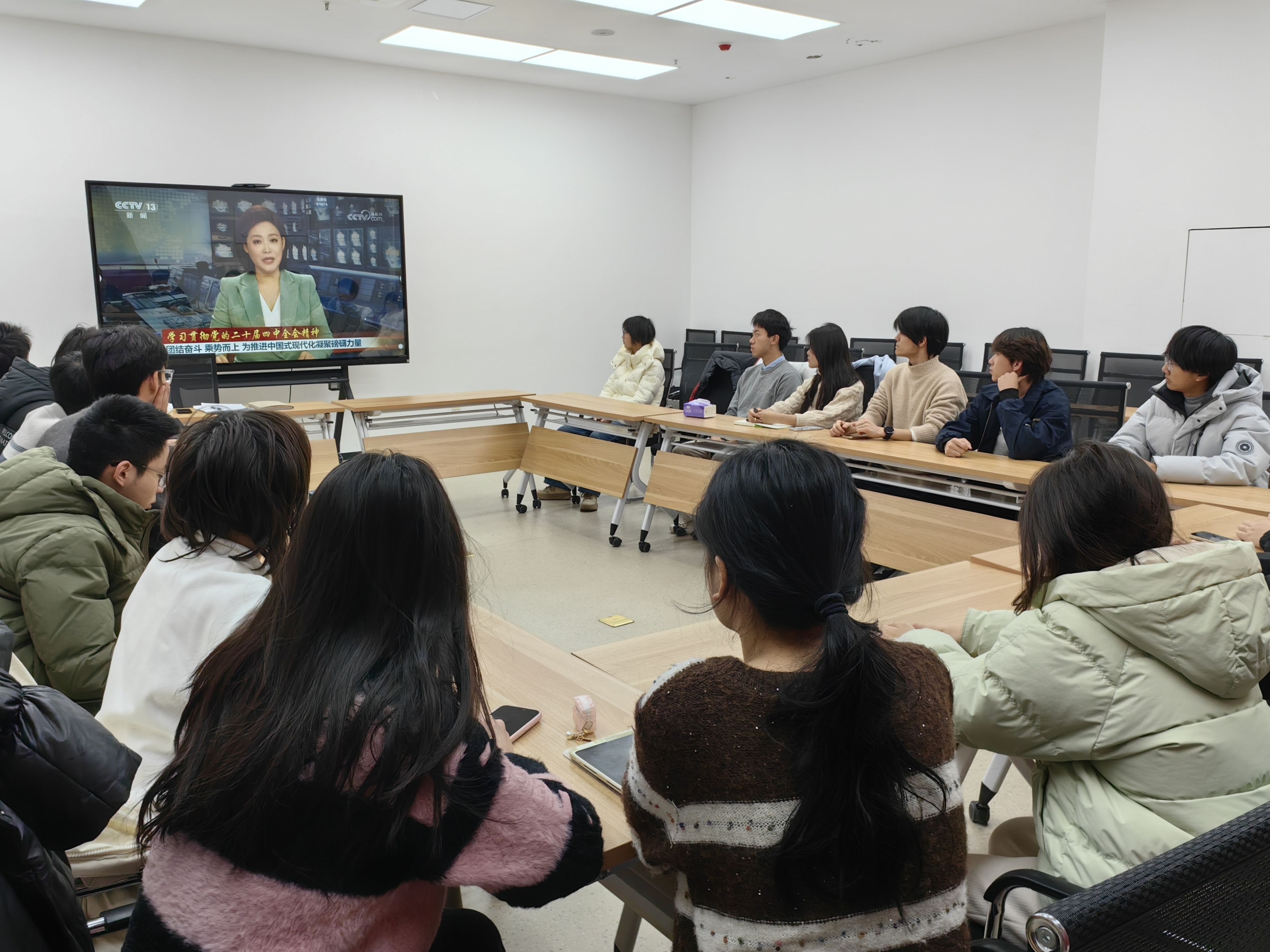 首先,同学们集中观看了介绍和解读党的二十届四中全会精神新闻发布会。这次全会是在向第二个百年奋斗目标进军的新征程上举行的一次十分重要的会议,对于进一步凝聚起全党全国各族人民磅礴力量,为以中国式现代化全面推进强国建设、民族复兴伟业而团结奋斗,具有重大意义。同学们深刻领会关于制定和实施五年规划的宝贵经验、建设现代化产业体系、构建新发展格局等重要论述。